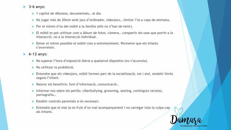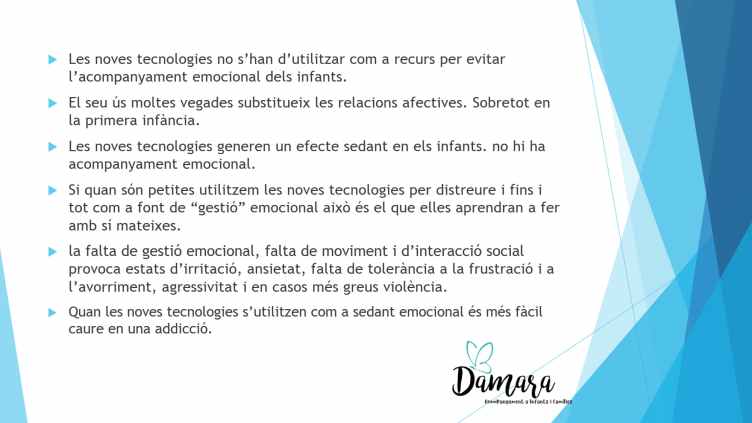 Com afecten i influeixen les noves tecnologies en el desenvolupament infantil? El passat 17 de novembre la comissió de formació de l’AMPA va organitzar la primera xerrada del curs, sobre un tema que ens preocupa i interessa a moltes famílies. La va impartir la Núria Gros Carmona, del centre Damara. Aquí us deixem la seva presentació, on hi trobareu informació ben interessant.